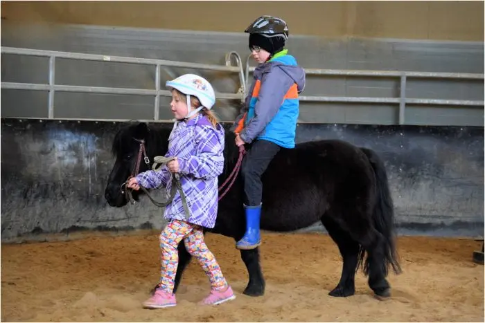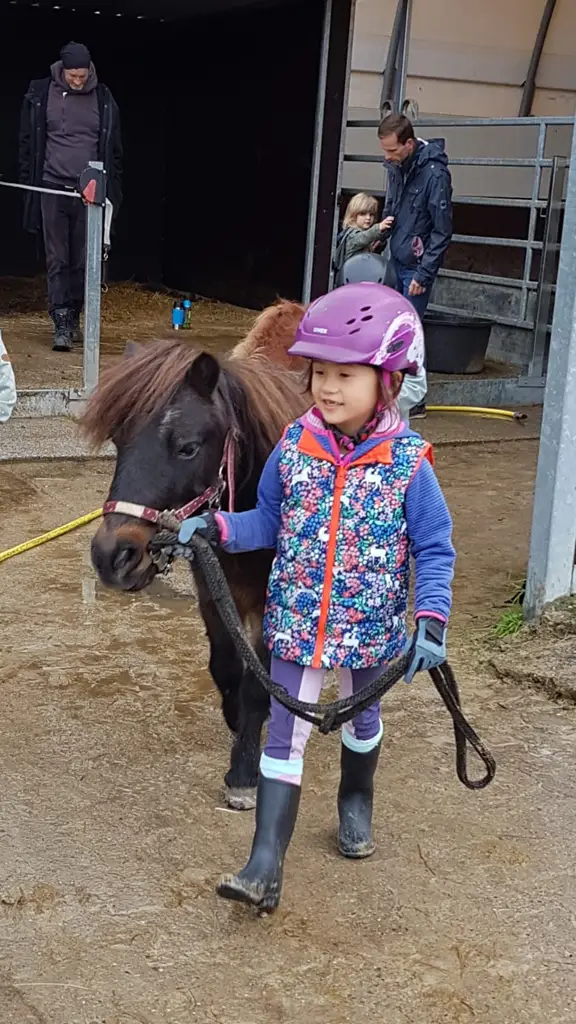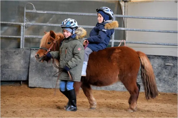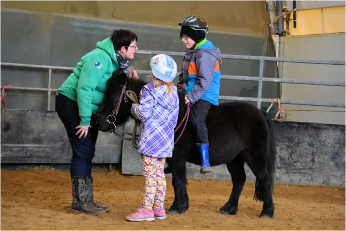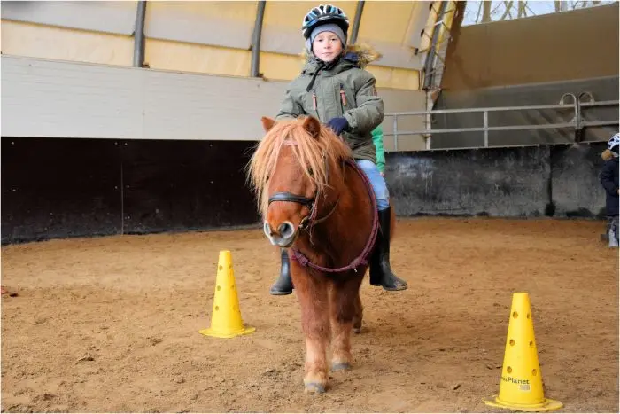 Vor dem ersten Reiten gibt es mindestens eine Pflicht-Theoriestunde, damit der Umgang mit dem Pony genau erlernt werden kann. Putzen, Satteln und Trensen wollen gelernt sein, bevor es dann ‘rauf auf das Pferd geht.